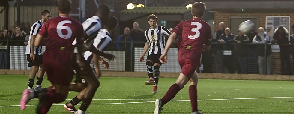 A long ball into the Fisher box did not appear to be particularly dangerous, but some defensive hesitation and the perseverance of the Balham forward, saw him get the wrong side of the back line and in attempting to get the ball back Ange Djadja was deemed to have held the striker and a penalty was awarded. Isaac Ogunseri guessed correctly in going to his right, but Piers Oldland’s well hit kick had too much power, despite Ogunseri getting a hand on it and nestled in the corner to level the game.
