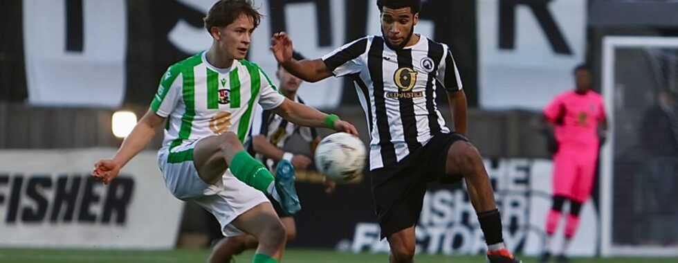 The second spell started badly for Fisher with Rusthall going close with a header that flew just wide, quickly followed by Kamara picking up a yellow card for dissent when questioning a throw in and dispatched to the sin bin. Fisher saw out the ten minutes with reduced numbers sensibly, keeping possession and limiting Rusthall to just one effort on goal that was well saved by Ogunseri. Kamara’s return to the field, sparked a spell of complete dominance for Fisher, as on seventy minutes they added to their lead when a superb through pass by Mbuenimo split the left back and centre half allowing Rafael Garcia to run through and lift the ball over the advancing keeper with aplomb. Eight minutes later Fisher added a fourth as again Garcia was threaded in behind the full back and cutting into the box pulled the ball back into the path of Lorenzo Duncan who opened out and side footed the ball into the far corner. A minute late the rampant Fish had a fifth as Rusthall were caught in possession in their own half by a strong press and Festos Kamara strode forward before rifling a low shot across Senneh into the corner of the net.